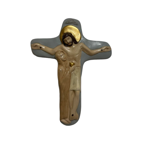 Muestra a Jesús unido a su Madre y recuerda el quinto dolor de la Madre Dolorosa. Realizada en yeso de máxima calidad, pintada a mano, terminación policromía. 27 x 20 cm