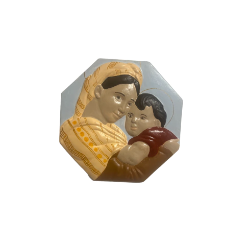 Placa con imagen realizada en yeso de máxima calidad que recrea la Virgen de la Silla de Rafael Sanzio, pintada a mano, terminación policromía. 14,5 cm